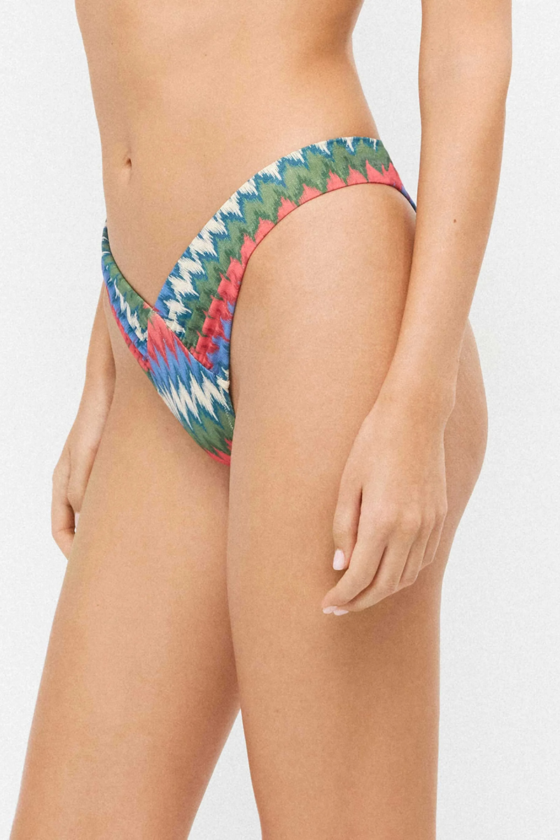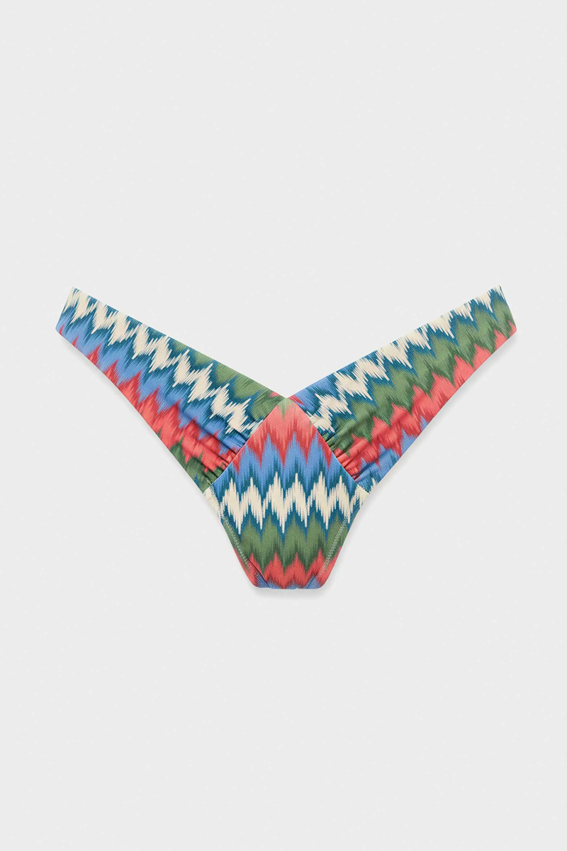 – Cueca de biquíni brasileira com corte em V e detalhes franzidos nas laterais.