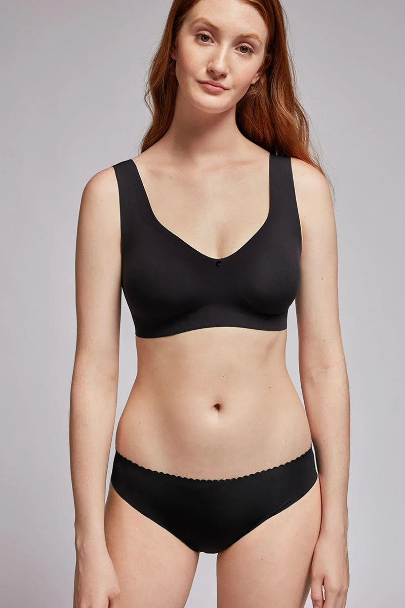 – Cuecas básicas invisíveis tecido microfibra com cintura termofundida e corte a laser para evitar marcas debaixo da roupa.