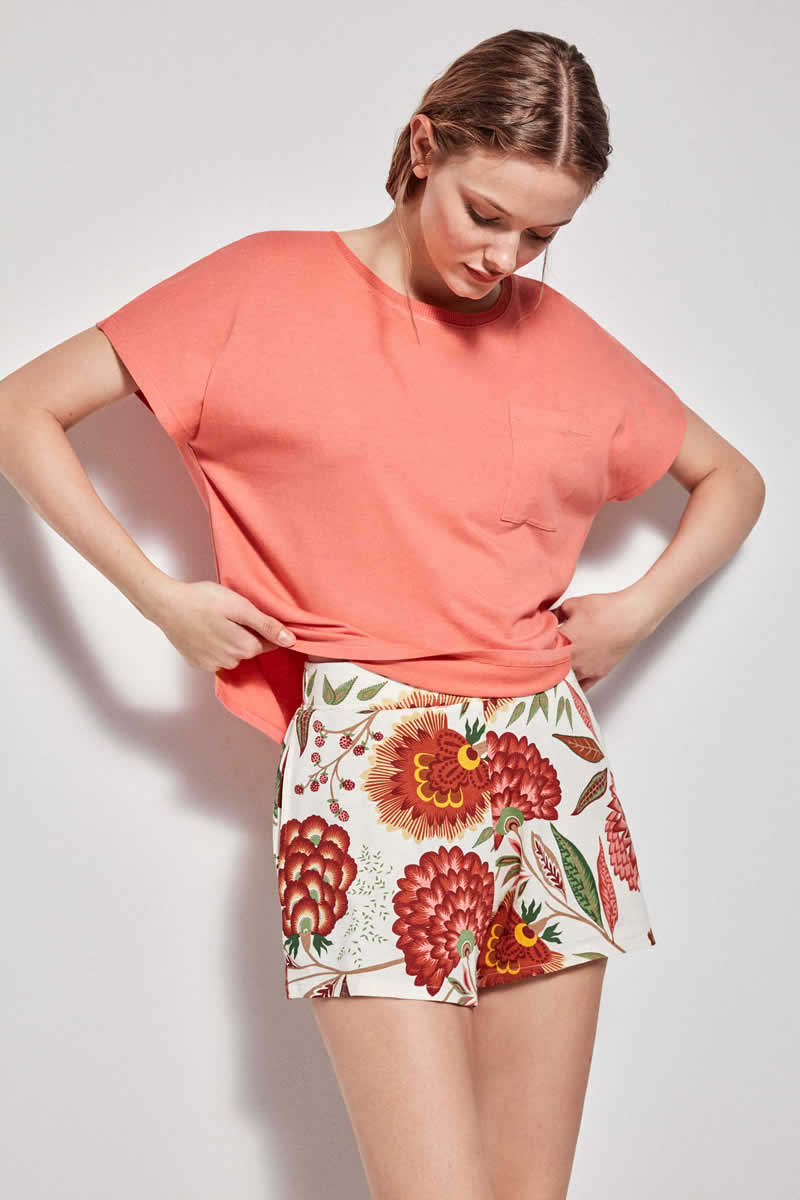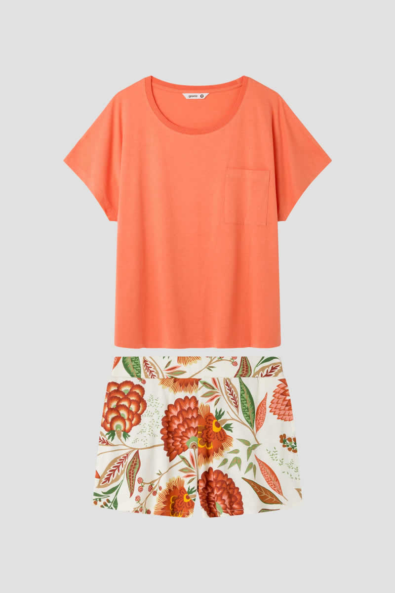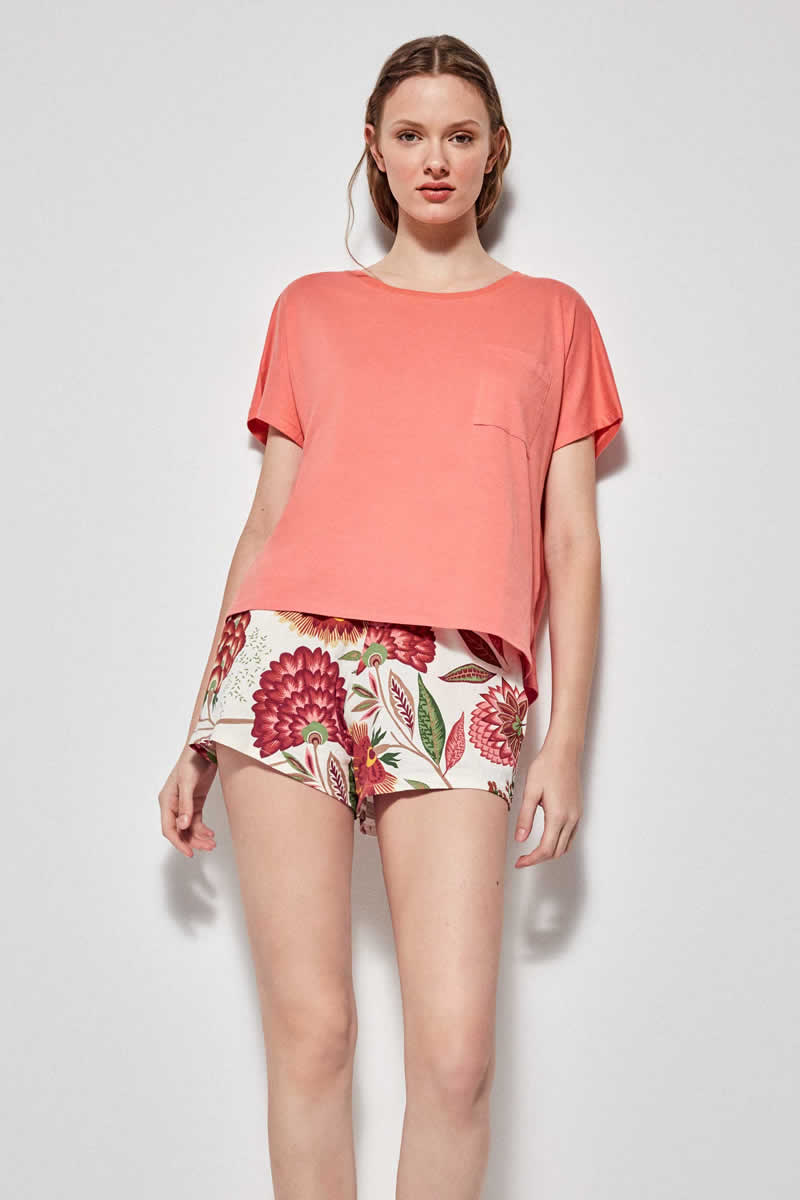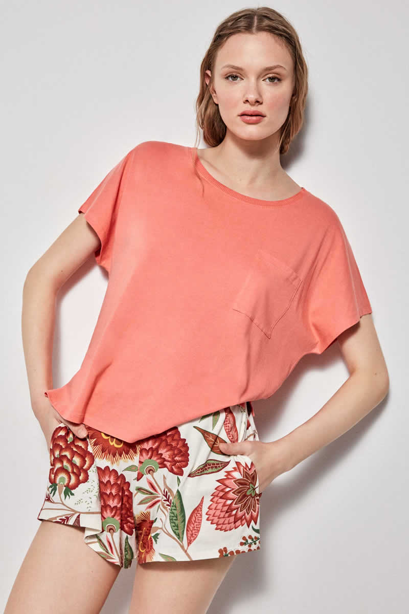 – Pijama curto com camisola lisa de manga curta e pormenor de bolso no peito.