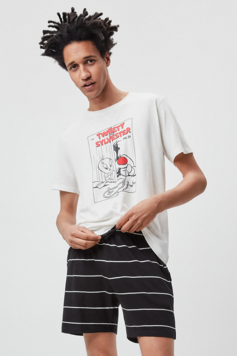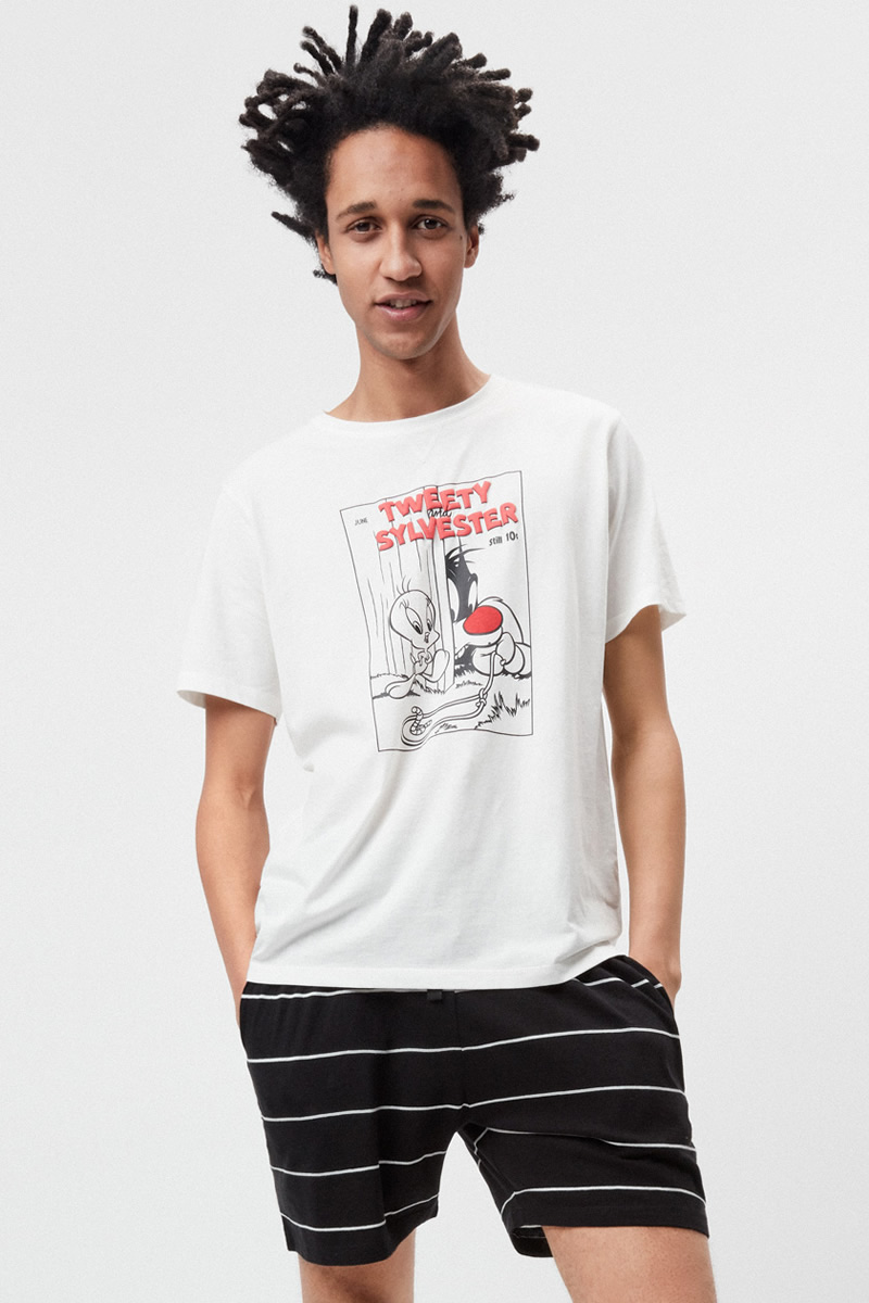 – Pijama curto de homem com t-shirt de manga curta e estampado de Tweety Bird ao centro.