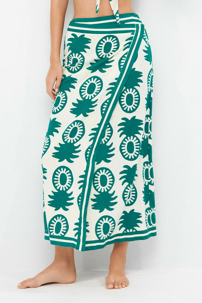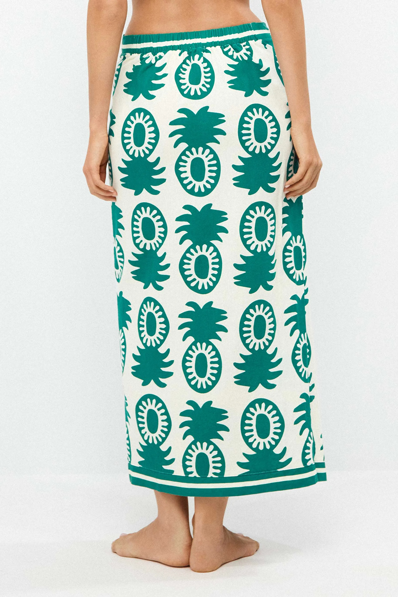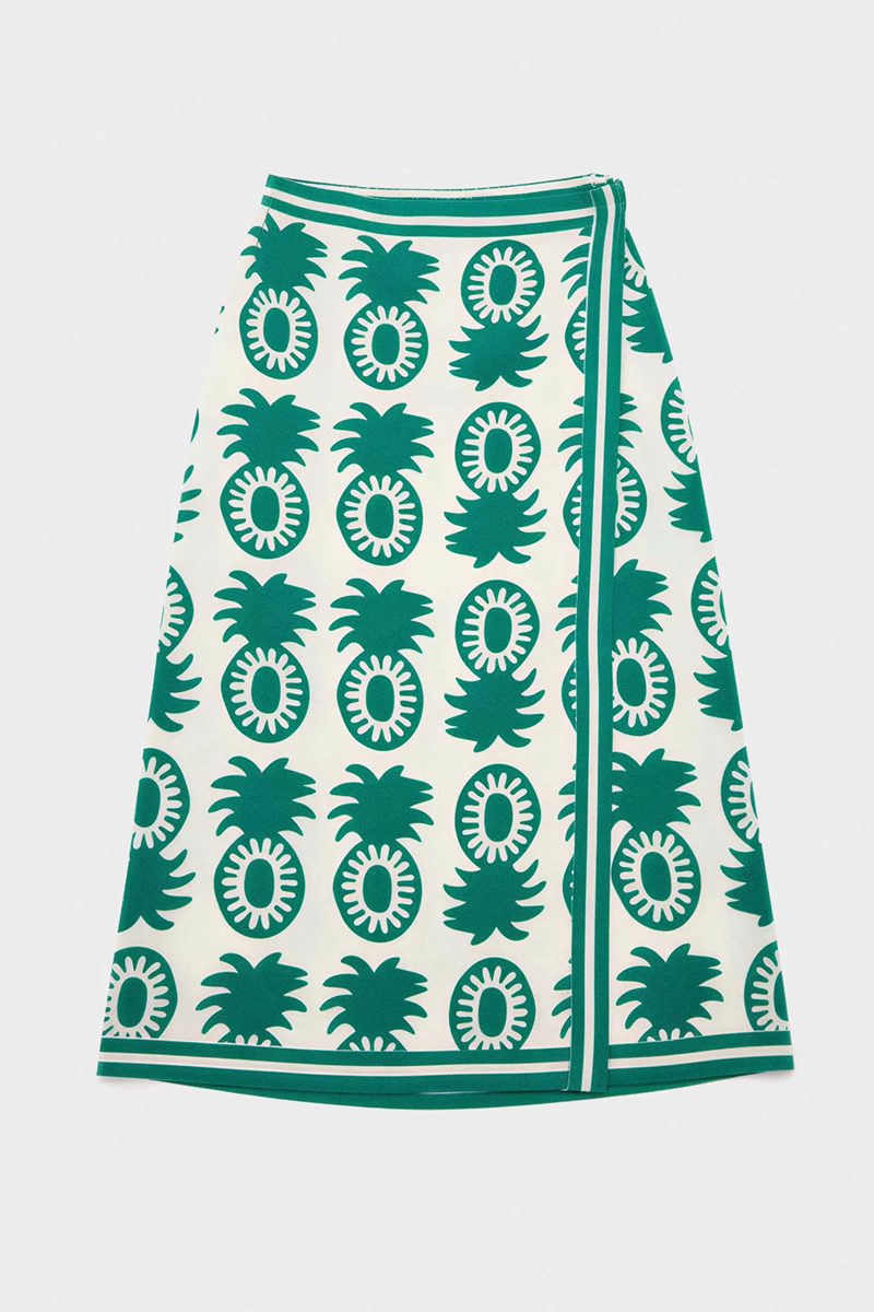 – Saia envelope com estampa de abacaxi, inspiração tropical e fecho invisível na lateral.