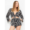 – Confeccionada em tecido fluido de viscose e poliamida com estampa animal de zebra.